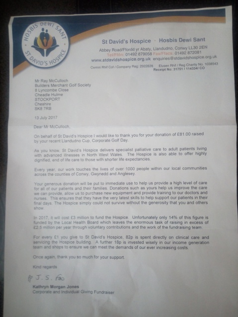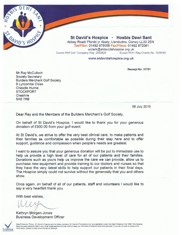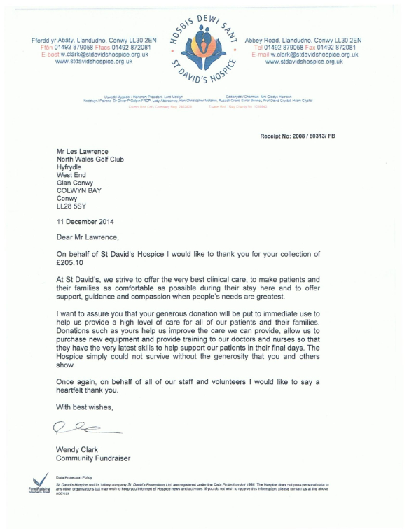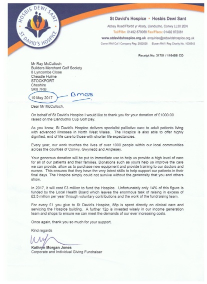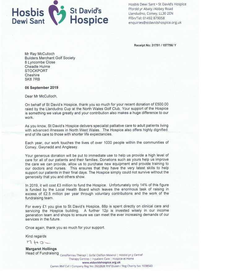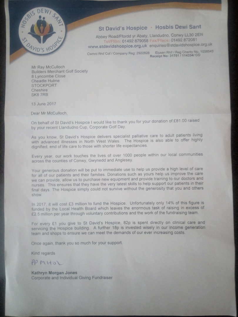 Thank you very much for your donation of £500.00 - to the St Davids Hospice in Llandudno - June 2019